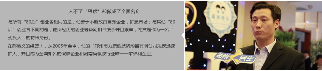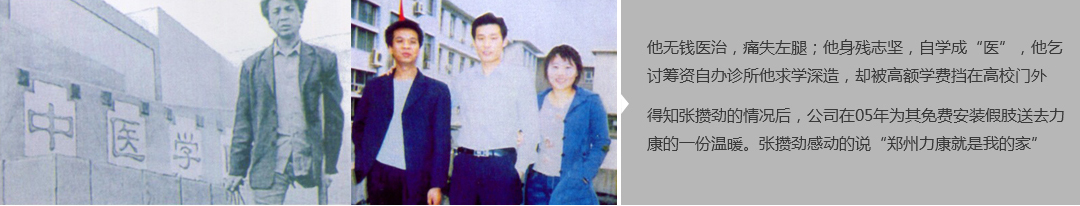鄭州市力康假肢矯形器有限公司(簡稱力康),是一家專業(yè)從事假肢矯形器的設(shè)計(jì)、研發(fā)、制作及裝 配的專業(yè)機(jī)構(gòu)。成立于1992年是河南省唯一一家福利企業(yè)。力康下設(shè)業(yè)務(wù)部、技術(shù)部、住院部、康復(fù) 部、售后服務(wù)部,并配有現(xiàn)代化的裝配車間和功能齊全的訓(xùn)練大廳,為殘疾朋友康復(fù)訓(xùn)練提供了可靠 保障??偨?jīng)理穿戴假肢多年,有著豐富的臨床經(jīng)驗(yàn)和親身體會(huì);多年來,力康已為全國幾十萬名殘疾 朋友安裝上舒適、美觀、耐用的假肢和矯形器具,使他們更大限度地恢復(fù)了正常的工作和生活?!爱a(chǎn) 品即人品”的質(zhì)量理念、先進(jìn)的技術(shù)、實(shí)惠的價(jià)格、完善的售后服務(wù)是力康取勝的法寶……